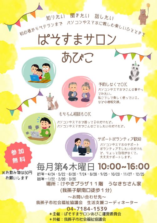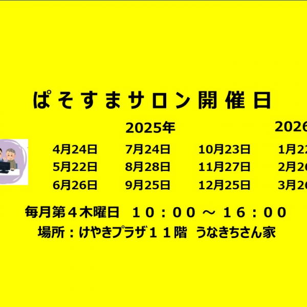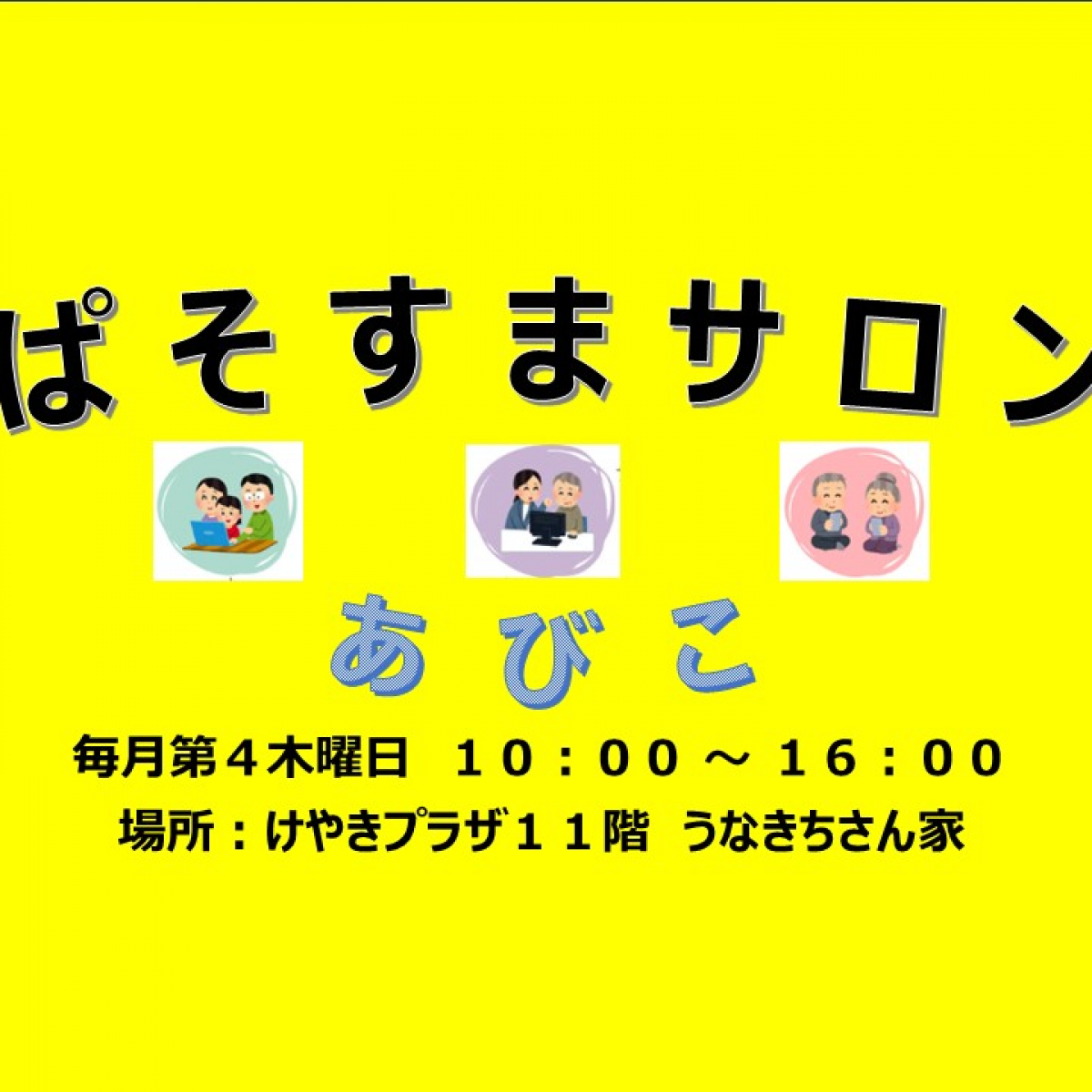 ぱそすまサロン あびこ 知りたい 聞きたい 話したい。初心者からベテランまで パソコンやスマホに親しむ楽しいひとときを。 予約無しでOK もちろん相談もOK 毎月第4木曜日はけやきプラザ11階 うなきちさん家へ