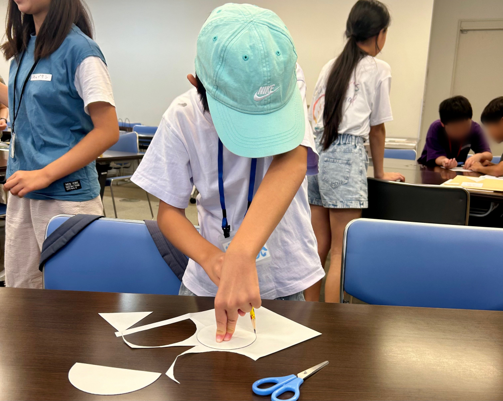 紙と文房具を使い、商品をつくります。ズレや破れがあると、マーケットでつけられる価値が下がってしまいます。他のグループよりも、お金を稼ごうと真剣です。