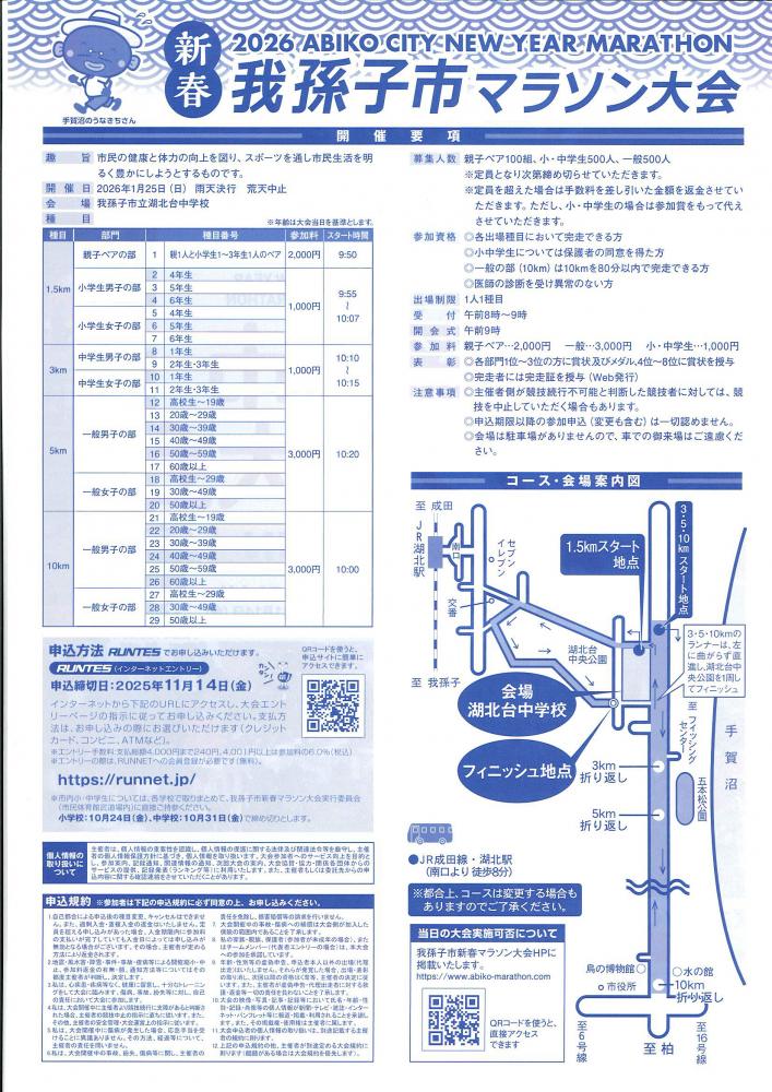 ※市内小・中学生については、各学校で取りまとめて我孫子市新春マラソン大会実行委員会に直接申込。