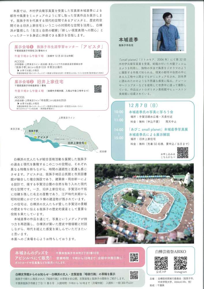 「small planet」で第32回 木村伊兵衛写真賞を受賞された本城直季さんが撮影した我孫子の風景作品を展示します。