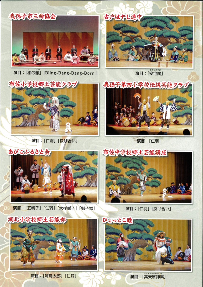 民俗芸能を伝承する市民団体のほか、小中学校の郷土芸能クラブが参加します。